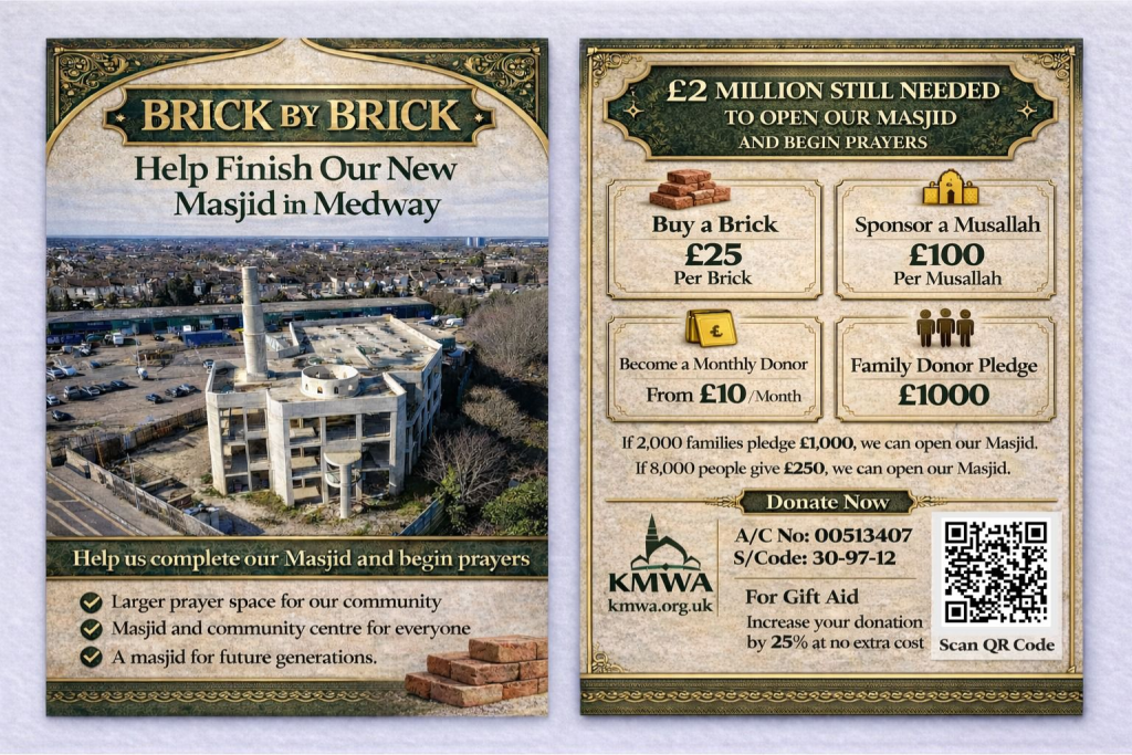 This Masjid belongs to our community. Let us finish what we started, together- and show the world that the Muslims of Medway stand united, generous, and full of faith.