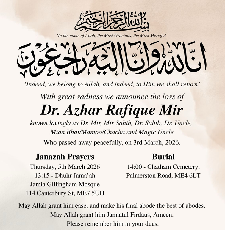 HomepagePrayer Timetables kmwa 3 hours ago Categories: Prayer Timetables With great sadness we announce the loss of Dr. Azhar Rafique Mir – a Founding Member of KMWA « Three Jummah Prayers at Gillingham Masjid kmwa: Related Post Three Jummah Prayers at Gillingham Masjid KMWA Ramadan Time Table 2026 – 1447 HIJRI